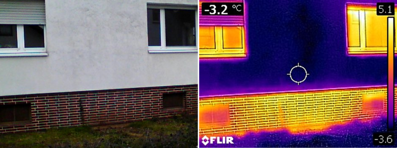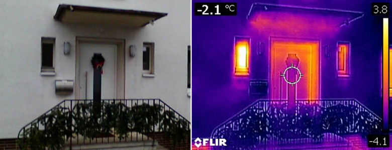 Wo mit bloßem Auge kein Unterschied zu sehen ist, zeigt das Wärmebild deutlich: Das ältere Fenster lässt erheblich mehr Wärme nach außen entweichen.